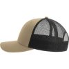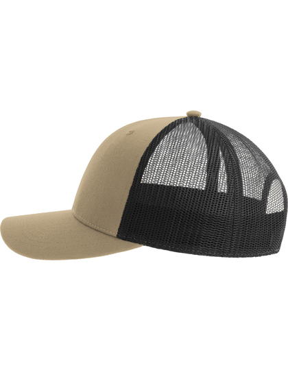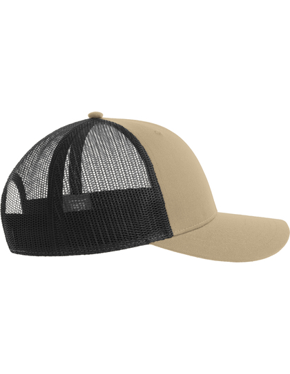 Hauptmaterial: 100 % zertifizierter recycelter Polyester-Twill / Seite und Rückseite: 100 % zertifiziertes recyceltes Polyester (aus 3 Flaschen hergestellt) | Klassische strukturierte Fünf-Segmente-Truckerkappe aus recyceltem Polyester-Twill | Recyceltes Mesh-Material zur Luftzirkulation | Snapback-Verschluss aus recyceltem PVC | Breite Form | Leichte und atmungsaktive Form