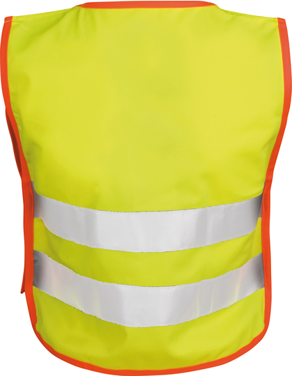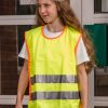EN1150:1999 Spezifikation | Entspricht EG Richtlinie 89 / 686 / EEC | Lässiger Schnitt für bequemes Tragen über der Kleidung | Saumnähte mit orangefarbenem Besatz | Elastische Seitenbänder mit verstellbarem Klettverschluss | 50 mm breite, aufgenähte Reflektions-Streifen | Gestricktes Polyester | Der Hersteller gewährleistet die Reflektionseigenschaft gemäß EN-Norm für 20 Waschgänge