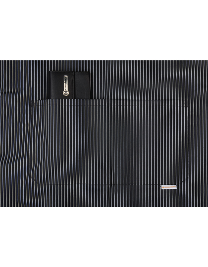 Köpergewebe, 185 g/m² | Hochveredelt, gekrumpft, farbig bedruckt, weiße Nadelstreifen | Latzschürze mit Bändern aus Schürzenstoff, mit Nahtsicherung | Latzband mit Schnalle zum stufenlosen Einstellen der Länge bis 70 cm | Aufgesetzte Tasche mit 2 Fächern, 34 x 18 cm | Waschbar bis 40°C