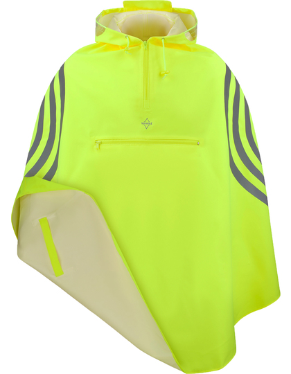 Wasserdichter 300D Oxford Stoff (Wassersäule 8000 mm) | Kapuze lässt sich über Fahrradhelm tragen | Kapuze mit Sichtfenster an den Seiten und mit einem Regenvisier an der Vorderseite | Gummischlaufen für die Handgelenke | Brusttasche mit Reißverschluss bietet Platz für das Smartphone beim Fahren; Poncho lässt sich anschließend darin verstauen | Zertifiziert nach EN343 | Mit modernem Reflektordesign | Mit Schlaufe zum Aufhängen und Trocknen | Ausgestattet mit EAN Barcode
