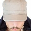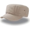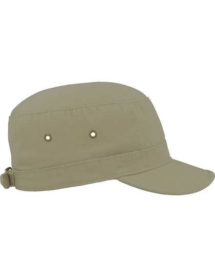 Kappe aus Baumwollstoff im Militär-Stil | Unverstärktes Frontsegment | Vorgebogener Schirm | Hinten komplett geschlossen mit Metallschnalle | 4 Metall-Ösen | Schweißband: 100% Baumwolle | Eine Ziernaht auf dem Schirm | Einfassung am Schirm | Verwaschene Optik